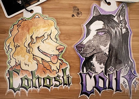 last friday we went to carolina furfare, this was my first furry convention in 11 years like what on earth... it was really fun, we were only able to go for one day because slater had work but it was so nice to be surrounded by fursuiters and artists. we definitely plan on going back next year, and we're thinking about getting some friends together and going to FWA since it's not that far away. it was a nice break from things and everyone was sooo nice. i made some badges for slater and i before we went, which you can see here...
